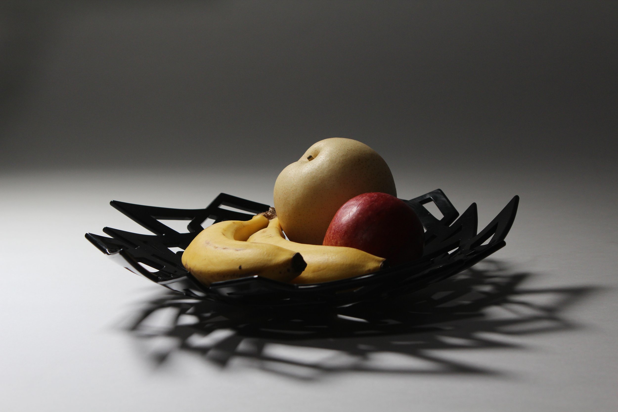 A laser-cut acrylic fruit bowl. Inspired by stars and constellations, the design compromises of a repetition of three shaped components that are repeated along a circle.