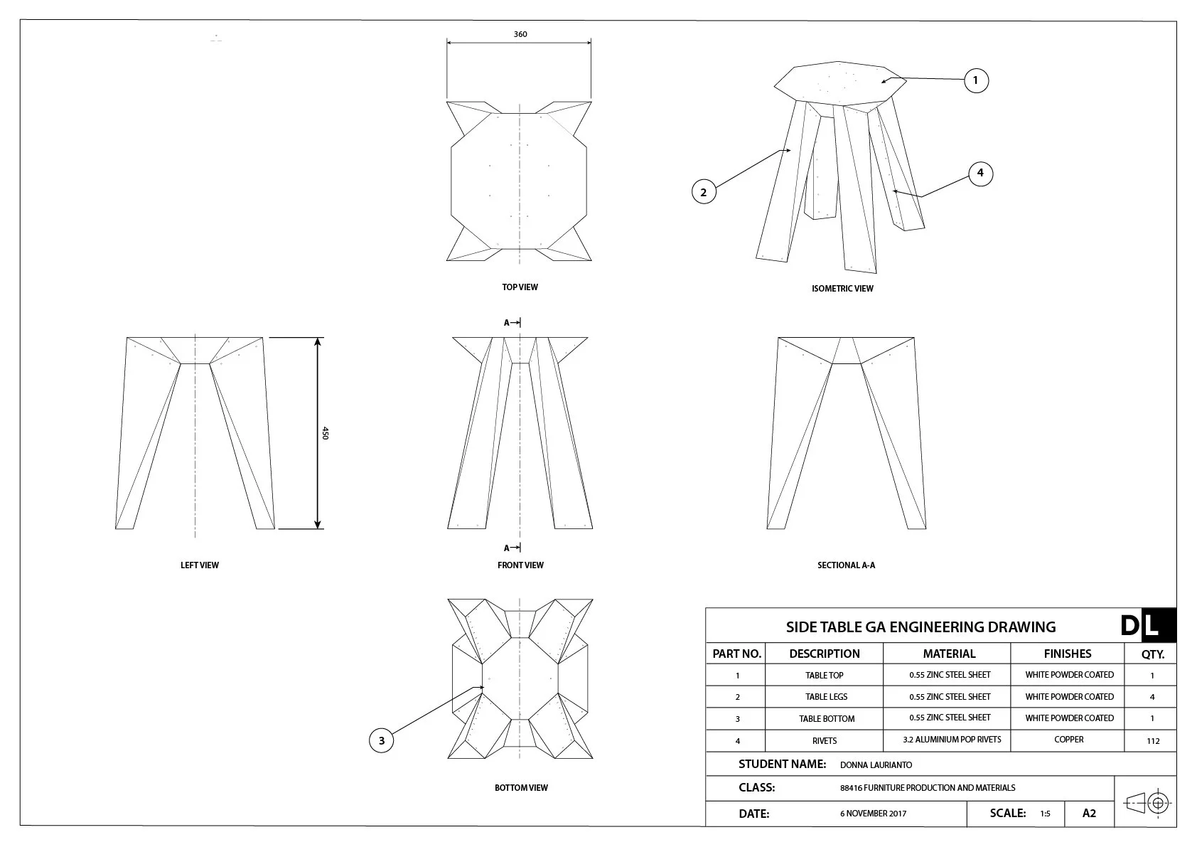 Forms are explored in Sketchup and cardboard prototyping. Then the final measurements in the form of an engineering drawing are sent to the laser cutting company. Metal laser cutting technology was used in creating the final product.